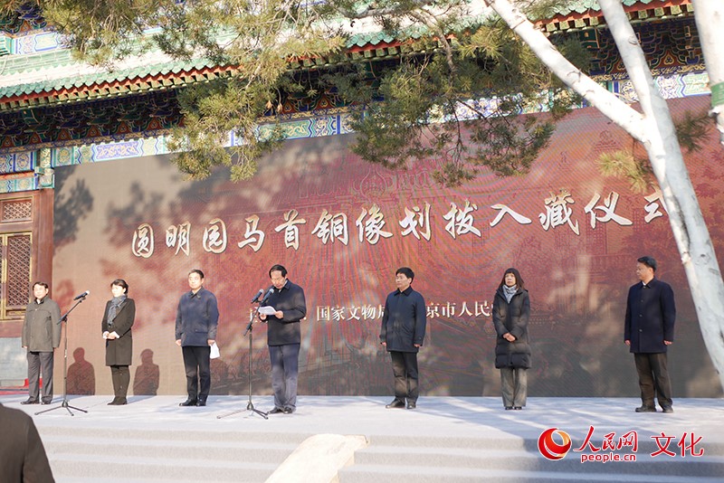 人民網(wǎng)北京12月1日電(韋衍行) 12月1日上午9時(shí),國(guó)家文物局、北京市人民政府在圓明園正覺寺舉行圓明園馬首銅像劃撥入藏儀式。國(guó)家文物局正式將圓明園馬首銅像劃撥北京市海淀區(qū)圓明園管理處收藏,馬首成為第一件回歸圓明園的流失海外重要文物,《百年夢(mèng)圓——圓明園馬首銅像回歸展》同期開展。