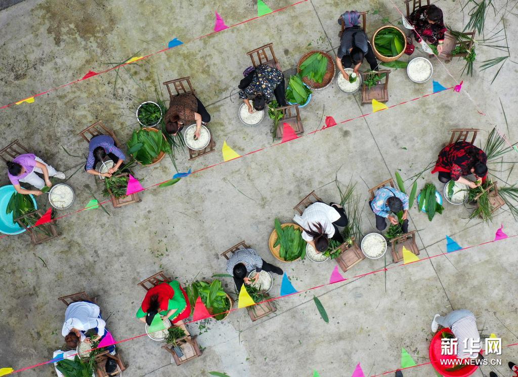 6月2日,貴州省銅仁市玉屏侗族自治縣亞魚鄉(xiāng)郭家灣村村民參加包粽子比賽(無人機照片)。端午節(jié)將至,貴州省銅仁市玉屏侗族自治縣亞魚鄉(xiāng)郭家灣村舉行“我們的節(jié)日,端午”群眾文化活動,村民們聚在一起比賽包粽子,喜迎端午節(jié)。新華社發(fā)(胡攀學(xué)攝)
