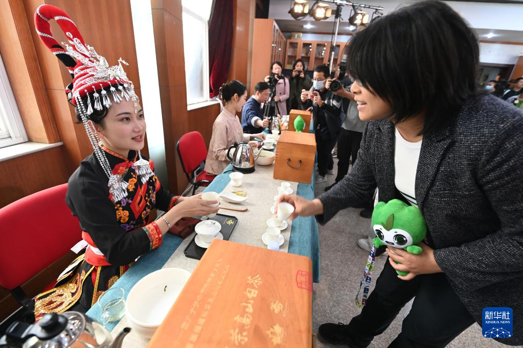 4月25日,來自柘榮縣的茶藝師(右)向新聞發(fā)布會參加者介紹柘榮白茶。