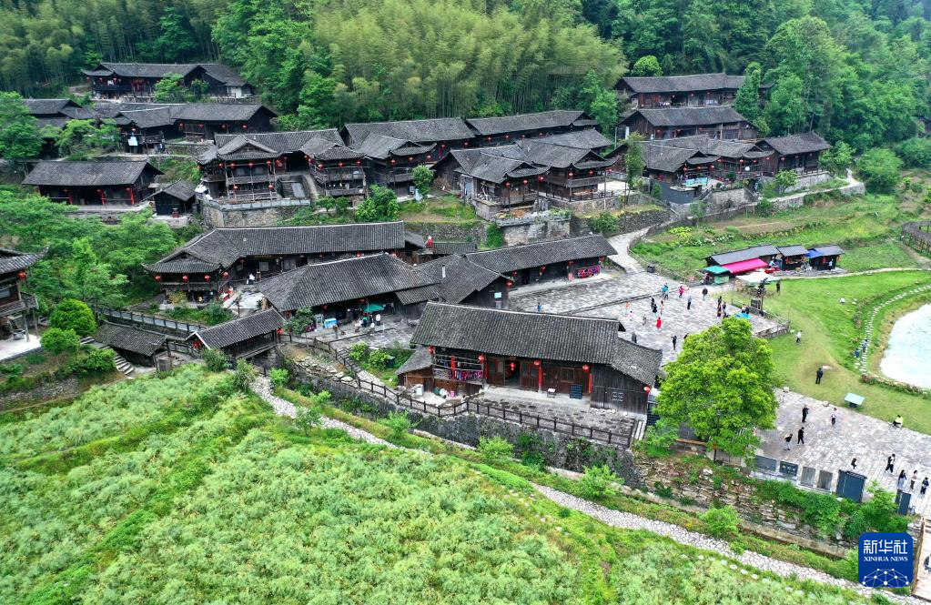 位于湖北省宣恩縣沙道溝鎮(zhèn)的彭家寨古吊腳樓群歷史悠久,吊腳樓保存完好,古樸雅致,是當(dāng)?shù)孛袼孜幕糜蔚臒衢T打卡地(5月2日攝,無人機照片)。