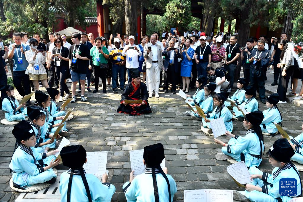 6月27日,在曲阜孔廟,嘉賓和游客在聆聽孩子們誦讀《論語(yǔ)》。