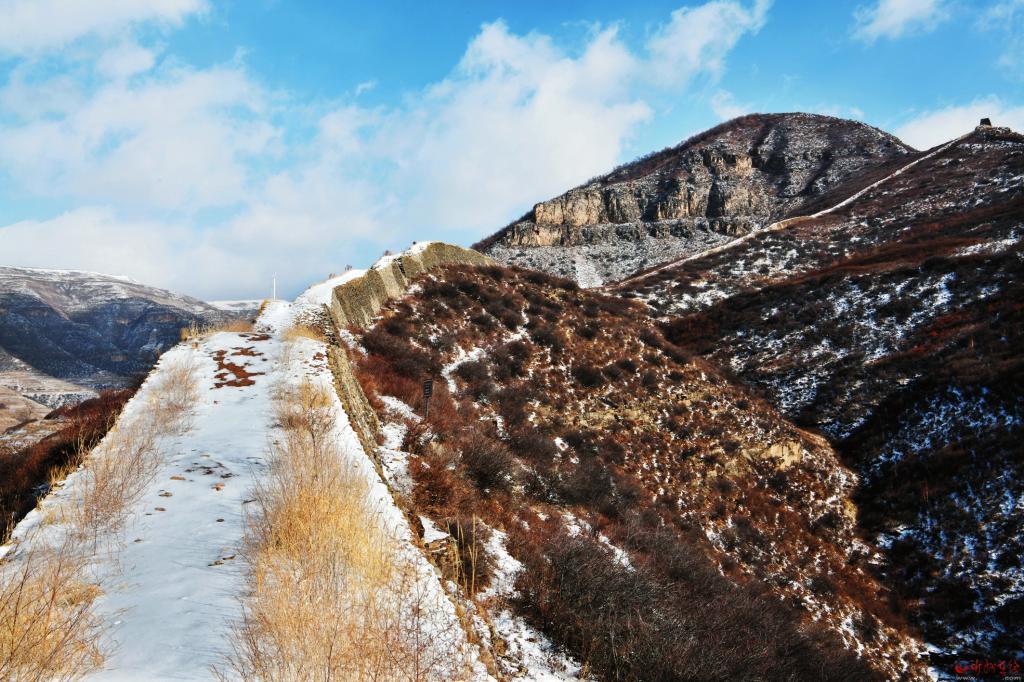 另一道長城是這樣的:史書上記載的宋長城出發(fā)地是草城川口天澗堡,實地中的草城川現(xiàn)在叫北川河,天澗堡古代可能有堡墻,如沒有,不可能有“川口有古城”的記載,可能歷經(jīng)千余年風雨被河水沖刷掉了,現(xiàn)在堡墻已不太明顯但有古文化層遺跡,還有兩座規(guī)模較大的烽火臺。長城從此出發(fā),向東爬上陡坡,順著一道山洼上到山頂。在山頂走了一公里余就與從興縣西來的北齊、隋修筑的早期長城匯合,在陡峭的山頂上形成一個完美的“岢嵐結”,也就是俗話中的“二把叉”形狀。這段宋代獨立修筑的長城大約有3公里。