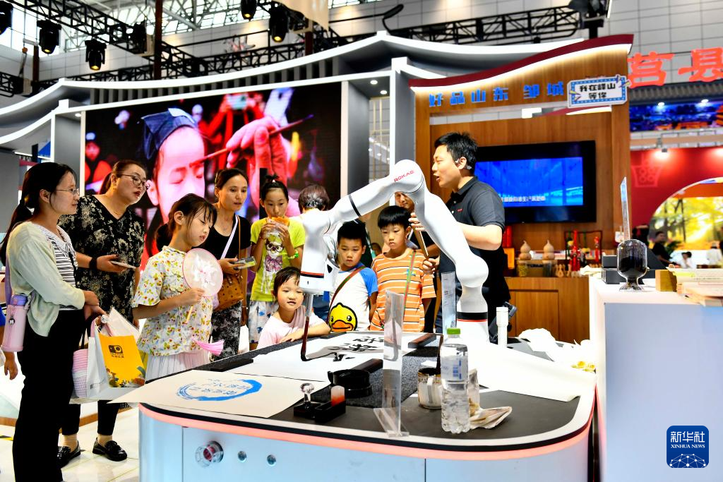 9月16日,在山東國際會展中心,來自濟(jì)寧市的參會人員在展示機(jī)器人書寫漢字。