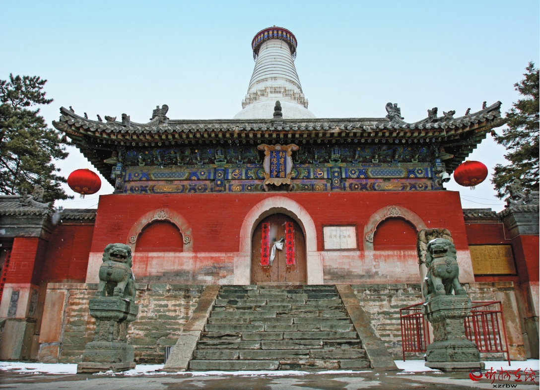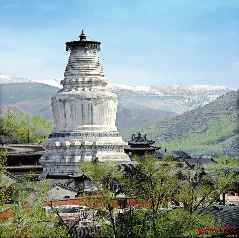大白塔全名釋迦文佛真身舍利寶塔。該塔在元大德五年(公元1302年)由尼泊爾匠師阿尼歌設(shè)計(jì)建造,塔身用石頭砌成。地上部分高度為56.37米,比北京北海大白塔高20.4米,故有“清涼第一圣境”的美譽(yù)。大白塔之東,一進(jìn)三院。前院為都綱院,中院為錢糧庫,后院為方丈院。