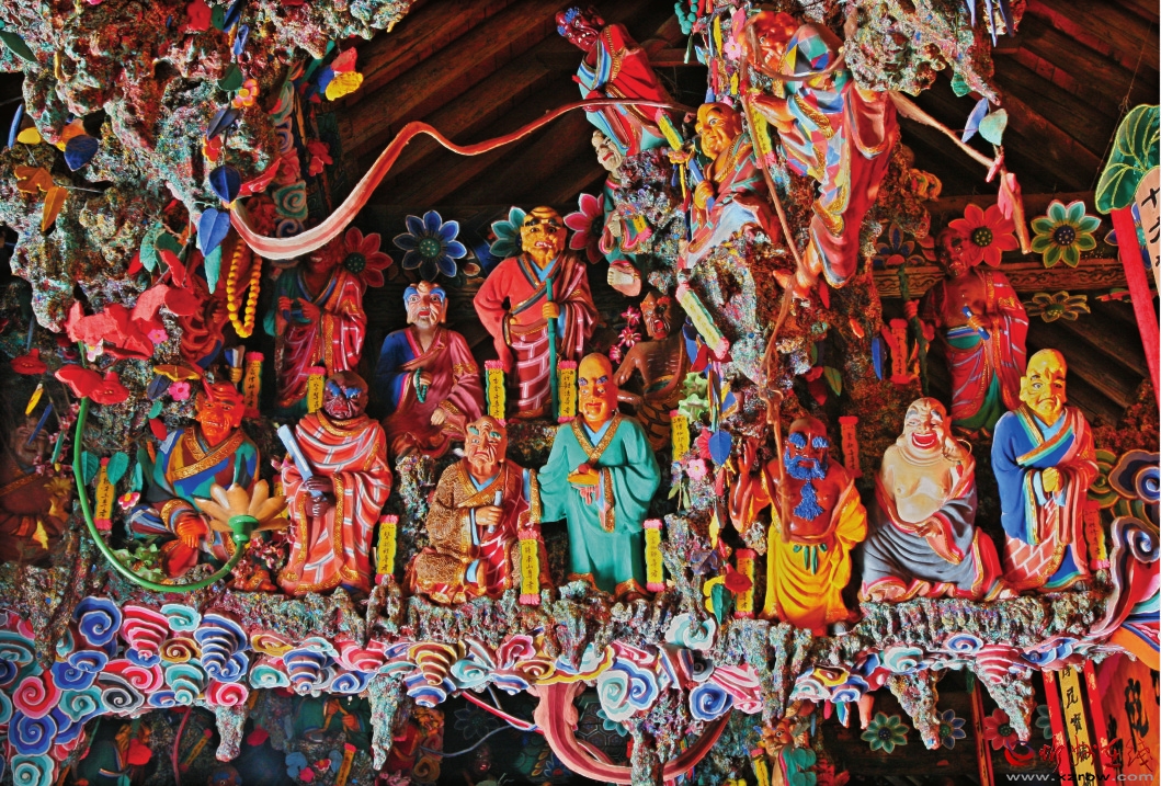 金閣寺現(xiàn)存的寺廟建筑及塑像,均在明、清、民國(guó)復(fù)修。寺廟坐北向南,占地面積2.l萬(wàn)平方米,呈正方形。穿牌坊,登臺(tái)階,進(jìn)天王殿,殿檐下掛著題有“金閣寺”的大匾。在第一處大院中間,矗立一座大閣,內(nèi)供高17.7米的千手(實(shí)為48臂)觀音銅像,這是五臺(tái)山最高最大的圣像。像原本為銅鑄,造于明嘉靖四年(1525年),后人重修該寺時(shí),為使觀音更加中性化,便在銅像外面貼泥、金妝,從肩膀兩旁伸出許多胳膊,手執(zhí)各種兵器,加成了48臂,顯得異常威武,號(hào)千手觀音。殿閣內(nèi),左右后柱兩個(gè)1米高的石柱礎(chǔ),為圓形中間束腰上下卷蓮瓣形,是唐代遺物。