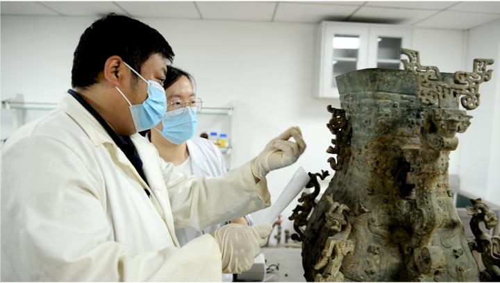 此外,為了堅持“最小干預(yù)”原則,保證文物真實性,此次修復(fù)并沒有對蓮鶴方壺進(jìn)行統(tǒng)一著色?!拔覀冎厍謇砹擞泻︿P,而記錄著文物信息的無害銹得到原汁原味保留,紅斑處留紅,綠銹處存綠,保留文物的歷史信息?!倍虐舱f。