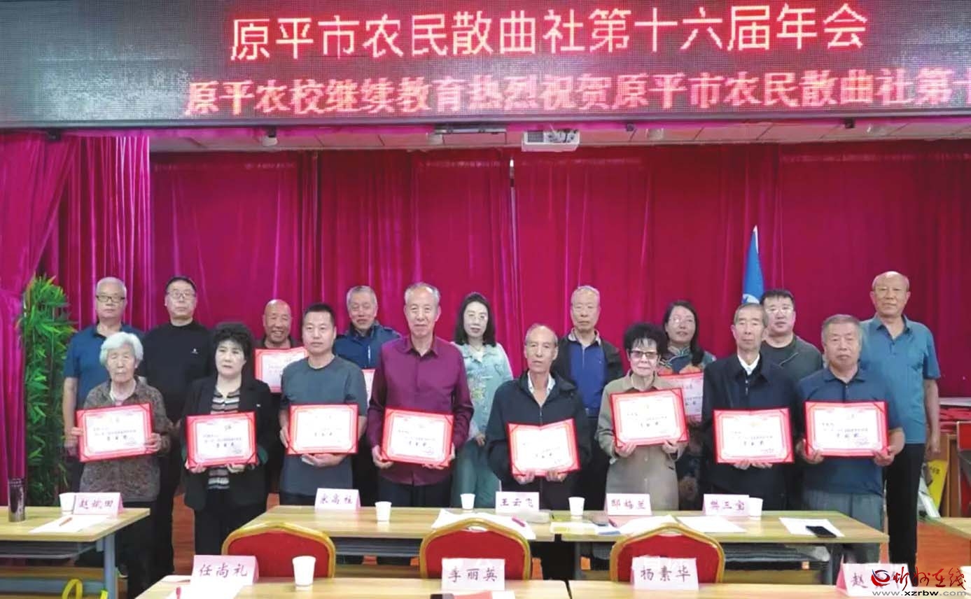散曲社朗誦部的曲友們在悠揚音樂聲中,激情澎湃地朗誦著五谷飄香的農(nóng)民散曲,20多名優(yōu)秀社員受到表彰,展示出原平農(nóng)民散曲的喜慶豐收景象?!霸娙绯保r(nóng)民種曲名聲在,情如火,南腔北調(diào)心澎湃。曲如海,同舟共濟承傳愛,暖如春,一年四季花不敗?;ㄩ_滿地鮮,曲韻熔天籟,好一個震驚曲界田園派。”這首散曲《正宮·塞鴻秋》道出了散曲社社員們的心聲。