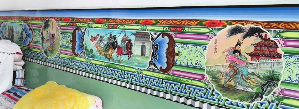 炕圍畫也叫墻圍畫,距今已有1200多年歷史,是原平人特有的“根脈性”藝術(shù)。手工藝人以墻為紙,將民族文化與當(dāng)?shù)厣睢⒕袂擅钊诤?,造型藝術(shù)集壁畫、年畫和建筑彩繪于一體,定格于墻壁之上,代代相傳?!?7歲起,我就跟隨父親學(xué)習(xí)炕圍畫技藝,如今有60多年了。”弓進(jìn)壽感慨道,“以前家家戶戶都會在炕邊畫炕圍畫。隨著時(shí)代變遷,人們住進(jìn)了樓房,我們就把炕圍畫畫在紙上?!?/p>
