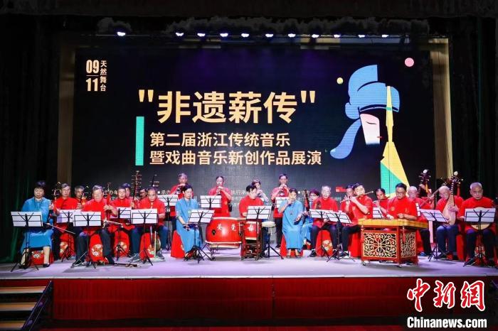 2024“非遺薪傳”第二屆浙江傳統(tǒng)音樂暨戲曲音樂新創(chuàng)作品展演上,石菊林(一排中間)和隊員們在演出。鐘靚 供圖