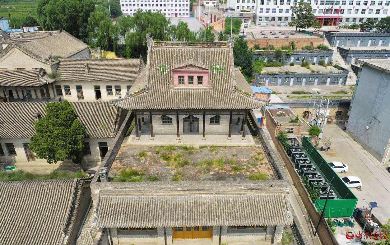 第四層平臺(tái)上,正對中軸線門洞的是大禮堂。大禮堂坐北朝南,長45米、寬24米。禮堂前設(shè)卷棚歇山抱廈3間,石雕柱礎(chǔ)石,木雕圈口暗八仙,柱間雀替鏤空雕刻花卉、飛禽等圖案。斗拱三踩,柱頭科耍頭萬字形,平身科耍頭龍形。禮堂內(nèi)置天花板,主席臺(tái)前木雕欄桿,上部設(shè)垂蓮柱;禮堂外左右各有5間教室,邊上為回長廊。禮堂后建石券窯洞9間,為教師宿舍,窯洞頂建木結(jié)構(gòu)房間15間,為教學(xué)辦公區(qū);禮堂西側(cè)是寬闊的操場。