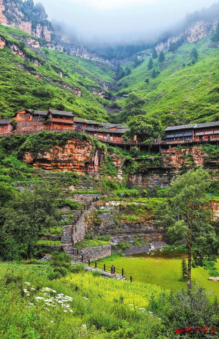 基巖構造、河谷沖擊、垂直生態(tài)、冷涼氣候……有別于他處的雋永靈秀,寧武之境實乃神來之筆。懸空村位于寧武縣管涔山深處,現(xiàn)為蘆芽山風景區(qū)的一個景點,因村莊懸于峭壁之上而稱奇。村里多以石頭和木材建房,村中唯一道路是由圓木搭起的空中棧道,行于其上,猶如走在半空,從崖底仰望,似空中樓閣,故而得名。