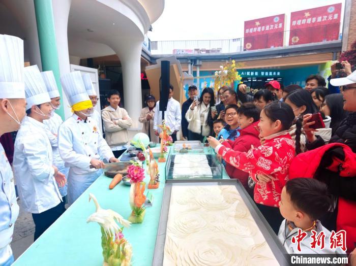 本次活動以“非遺傳承+美食創(chuàng)新”為主線,構(gòu)建起沉浸式非遺美食體驗矩陣。在桂菜非遺展示區(qū),巨型蔬果雕塑與恭城大肚粑、茉莉六堡茶膳等20道桂味珍品靜候品鑒。極限刀工挑戰(zhàn)區(qū)則化身廚藝競技場,蒙眼雕豆腐、氣球切菜等絕技輪番上演,穿針引線刀法與果蔬雕刻技藝令人嘆為觀止。不僅能現(xiàn)場品鑒非遺美食,更可圍觀大師調(diào)配特色蘸料,在技藝可視化的展演中,感受桂菜從傳統(tǒng)守護(hù)到創(chuàng)新突破的多維魅力,助力非遺美食IP破圈傳播。