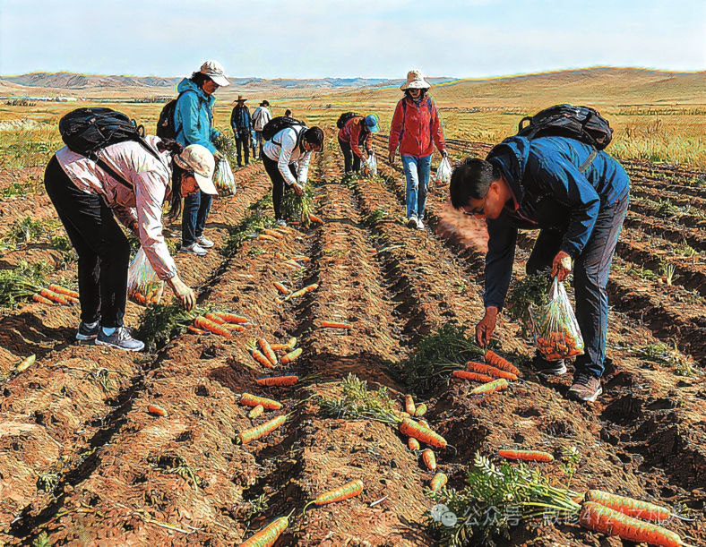 “撿秋”游演繹著“鄉(xiāng)土中國(guó)”的現(xiàn)代篇章。費(fèi)孝通在《鄉(xiāng)土中國(guó)》開(kāi)篇即言“從基層上看去,中國(guó)社會(huì)是鄉(xiāng)土性的”。這種“鄉(xiāng)土性”的核心是人與土地的深度綁定。農(nóng)民靠土地生存,土地是文化認(rèn)同的根基?!皳烨铩边@種農(nóng)耕活動(dòng),如今以更加鮮活方式延續(xù)下來(lái)。對(duì)農(nóng)民而言,土地不僅是謀生手段,更是安身立命的“精神原鄉(xiāng)”。而城市游客的參與則賦予了“撿秋”新的意義。在城市里待久了,就想蹲在田里感受泥土的溫度,游客“撿秋”體驗(yàn)的是“春種秋收”踏實(shí)感。這種體驗(yàn)式參與是現(xiàn)代人對(duì)鄉(xiāng)土文明的“情感反哺”。游客們彎腰的身影既是對(duì)土地的致敬,也是對(duì)“根”的追尋。他們未必真懂農(nóng)事,但通過(guò)參與“撿秋”完成了對(duì)鄉(xiāng)土文化的認(rèn)同,被撿起的“果實(shí)”從“生存作物”演變?yōu)椤拔幕浇椤?。?dāng)前,內(nèi)蒙古各地推出的挖土豆、烤土豆等旅游項(xiàng)目是對(duì)鄉(xiāng)土資源的文化再“編碼”,當(dāng)土豆從田間走向游客的后備箱,“鄉(xiāng)土中國(guó)”便獲得了更加豐富的表達(dá)。