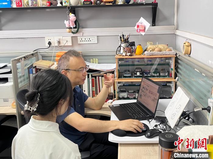 5月8日,江漢大學(xué)設(shè)計(jì)學(xué)院教授魏坤正在指導(dǎo)學(xué)生創(chuàng)作標(biāo)識。武一力攝