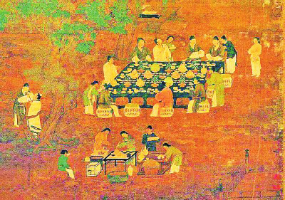 宋代面食既有團(tuán)子狀、面疙瘩狀的,也有薄片狀、條狀的,前者可以用湯匙吃,后者多用筷子吃。此外,《東京夢華錄》中還詳細(xì)介紹了宋代餐廳的外觀、菜肴及客人點菜方法:“每店各有廳院東西廊,稱呼坐次??妥?,則一人執(zhí)箸紙,遍問坐客。”大意是說,每家店都有廳堂、庭院、東西廊,待客人落座,店家便送上筷子、紙花,詢問客人要吃些什么。