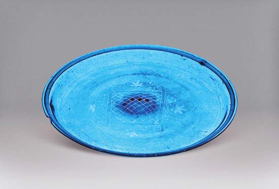 據(jù)地宮出土的物賬碑記載,整個地宮被布置得“窮天上之莊嚴,極人間之煥麗”。在這些文物中,有六件來自阿拉伯國家的刻紋藍玻璃盤。玻璃盤保存完好,為無模吹制成形,通體藍色,晶瑩光潔,盤面刻滿紋飾,主體紋飾為以雙線勾勒出的十字形框架,盤心為正方形方框,方框外刻四個拱門形狀的尖瓣,與中心方框組成四個“米哈拉布”紋樣?!懊坠肌笔且了固m教清真寺大殿的禮拜龕,四個尖瓣內(nèi)各刻一朵五瓣葉子植物紋,尖瓣之間也飾以植物紋。制作工藝是在玻璃成器之后,用比玻璃更堅硬的工具在其表面淺刻花紋,加以描金,從而使得玻璃盤更為華麗。