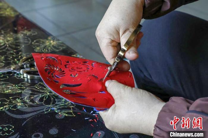 山西晉城高平市非遺剪紙傳承人羅繼蘭以“蛇元素”為主題,創(chuàng)作剪紙作品。 邢宇琛 攝