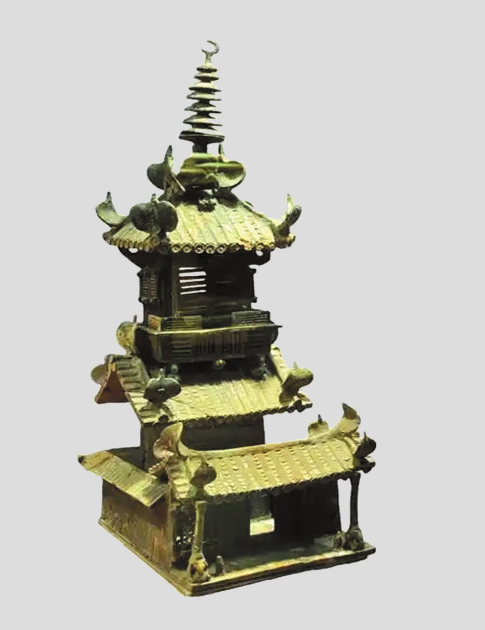 樓閣式塔是樓閣上增加塔剎而形成的。湖北省襄樊市(今湖北省襄陽(yáng)市)樊城一座墓葬曾出土過(guò)樓閣式佛塔模型,通高104厘米,有兩層,屋頂有7層相輪,塔剎頂端有仰月。1986年,四川省博物館的工作人員采集到一塊漢代畫像磚,上面也有清晰的樓閣式塔圖案。樓閣和樓閣式塔不同,樓閣式塔必須具備佛塔的標(biāo)志——塔剎。塔剎的基本形式是覆缽式塔的縮小版,也就是說(shuō)將印度形體巨大的覆缽式塔,微縮之后放置于中國(guó)傳統(tǒng)的樓閣頂上,就形成了樓閣式塔。