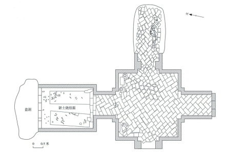 而M27獨(dú)居?xùn)|區(qū),間距達(dá)100余米,與前兩墓形成鮮明反差,墓磚無(wú)任何涂紅,隨葬品僅見(jiàn)素面灰陶罐、陶碗,東漢常見(jiàn)釉陶禮器(耳杯、案、盤(pán)等)完全消失,墓道呈“口小底大”特殊結(jié)構(gòu),墓室西北角設(shè)灶,突破同期墓葬的空間布局傳統(tǒng)。
