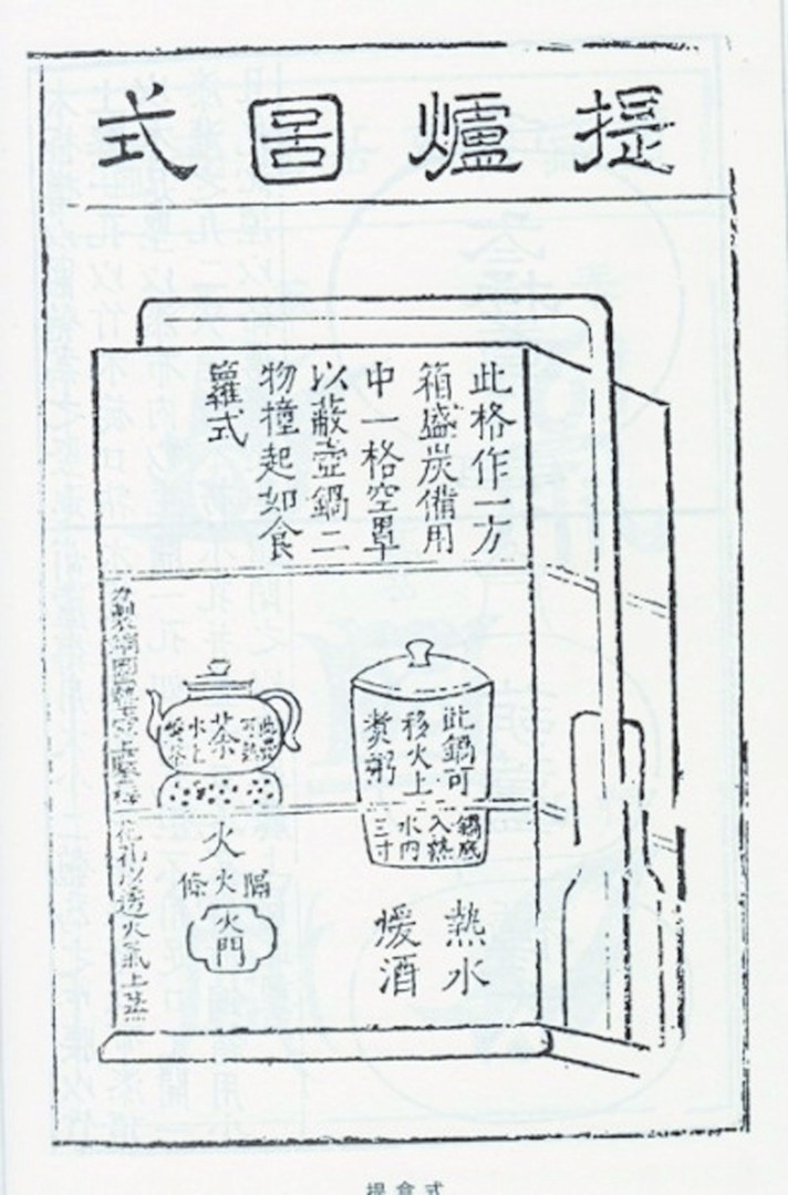 根據(jù)文字與插圖可以看出,提爐的靈感來自當(dāng)時(shí)普遍使用的“三撞”,即三層式提盒,由可以靈活組裝或分卸的幾部分組成,包括一個(gè)帶有底座的提梁架、兩層方屜盒、一個(gè)四方形圍框,以及一只銅質(zhì)四方形的水火爐。兩層屜盒與四方形圍框在外徑上尺寸一致,且彼此采用子母口套合,可以按照一層屜盒在下、四方形圍框在中、一層屜盒在上的形式疊置,并依靠子母口嵌合牢固。下層方屜盒的外徑尺寸要與提梁架底座上的淺凹槽正好相當(dāng),這樣在移動(dòng)過程中,屜盒就能牢固嵌置在底座的凹槽內(nèi),不會(huì)脫落。整套配置中最重要的組件是一只小銅火爐,這只銅爐亦為四方形,外徑與下層屜盒的內(nèi)徑相當(dāng),可以恰好放置在屜內(nèi),不會(huì)晃動(dòng)。此爐之所以名為“水火爐”,是因?yàn)闋t體的內(nèi)部用銅板隔為左右兩個(gè)用途不同的區(qū)域,分別發(fā)揮煮水風(fēng)爐與燙酒器的功能。左半部的頂面安有圓形灶,可以放入火炭,在其側(cè)壁上則開有火門,用以通風(fēng)、清灰,因此只要將特制的茶壺置于灶上,就可以隨時(shí)生火煮水,沖茶品茗;右半部則僅在頂面開有一個(gè)圓口,使用的時(shí)候通過圓口向內(nèi)注入熱水,然后把一只與圓口大小相配的帶蓋小桶放入其中,再把酒注入小桶,將酒燙熱。小桶是為了組合方便精心設(shè)計(jì)的,還可以擔(dān)任袖珍煮鍋的角色,故《遵生八箋》中稱其為“小鑊”。游玩中肚子餓時(shí),還可以隨時(shí)把這只小桶放到灶口上,煮粥或者其他便于快速制作的飲食,就地來一頓野餐。