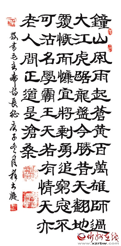 二是程老有真功。他一人能熟練書寫甲骨、篆書、魏碑、曹全隸、乙瑛隸、章草、歐柳楷、顏趙楷、行楷、行書、行草、草書、伊秉綬隸、創(chuàng)新粗圓、創(chuàng)新仿宋、創(chuàng)新大黑、創(chuàng)新角篆、仿毛體18種書體(見圖)。還會(huì)畫畫寫詩,詩書畫樣樣精通。對(duì)程大凝而言,臨帖是他最大的快樂,創(chuàng)作是他最大的滿足?,F(xiàn)在他的工作室有4000多幅作品。退休后參加全國(guó)性書法大賽就獲獎(jiǎng)300余次。