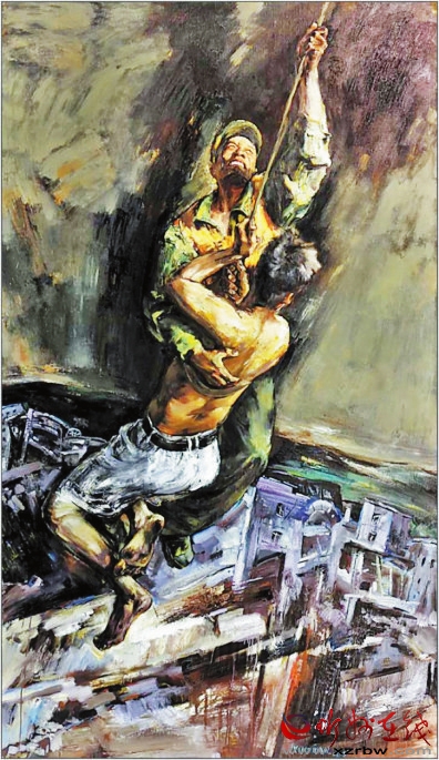 作品《空中救援》中,觀者首先感受到的就是難度。主題表現(xiàn)的事件難度和畫(huà)面表現(xiàn)處理的難度交織在一起,讓我們?cè)隗@險(xiǎn)、焦急的心理壓力下感受到生命的脆弱。空中救援成了生命的唯一通道。救援同樣是險(xiǎn)象環(huán)生、驚心動(dòng)魄。從畫(huà)面處理技巧上是一種挑戰(zhàn),天空與地面的透視關(guān)系,動(dòng)感與靜態(tài)的對(duì)立統(tǒng)一,那種命懸一線(xiàn)的緊迫感對(duì)心理的沖擊力,通過(guò)大刀闊斧的刮刀、筆觸處理,和蒼涼緊迫的色調(diào)關(guān)系,準(zhǔn)確地展示了主題思想,大膽省略了一些不必要的細(xì)節(jié)描寫(xiě)。用大筆觸、大色塊表現(xiàn)背景的壓抑和險(xiǎn)峻,救援主體成為沖破這一重壓的希望之色。沒(méi)有去刻意刻畫(huà)天與地的真實(shí)場(chǎng)景,簡(jiǎn)潔概括但不呆板空洞,這種果斷的駕馭,是續(xù)鶴賢真實(shí)實(shí)力的體現(xiàn)。 邢晨聲 文