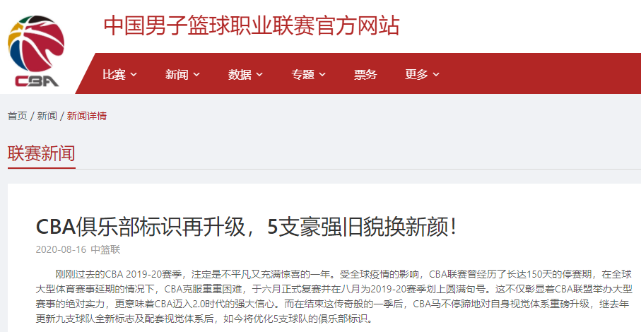 人民網(wǎng)北京8月17日電(楊喬棟)剛剛過去的CBA 2019-20賽季,注定是不平凡又充滿驚喜的一年。16日,CBA公司發(fā)布公告稱,本著對(duì)CBA聯(lián)盟視覺體驗(yàn)不斷升級(jí)的宗旨,CBA聯(lián)盟對(duì)遼寧(飛豹)、吉林(東北虎)、新疆(飛虎)、廣廈(猛獅)、福建(鱘魚)5支球隊(duì)優(yōu)化升級(jí)俱樂部標(biāo)識(shí)。優(yōu)化后的新標(biāo)識(shí)將于2020-21賽季開始正式使用。這也是繼去年更新九支球隊(duì)全新標(biāo)識(shí)及配套視覺體系后,新添加的五支更換俱樂部標(biāo)識(shí)的球隊(duì)。