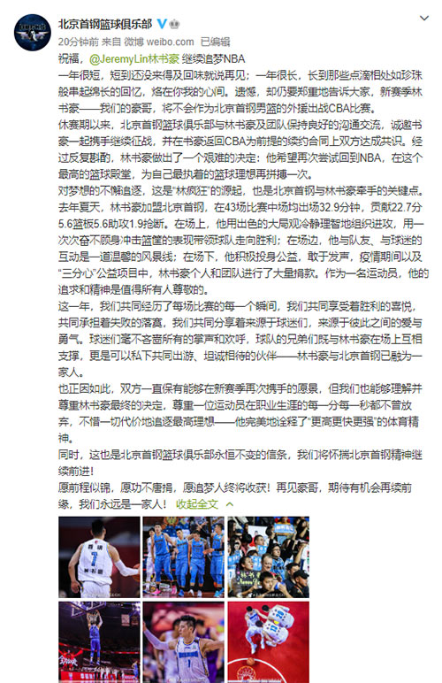 人民網(wǎng)北京9月15日電(楊喬棟)15日,林書(shū)豪通過(guò)個(gè)人社交平臺(tái)發(fā)布自制視頻宣布,下個(gè)賽季將不再代表北京首鋼男籃征戰(zhàn)CBA賽場(chǎng),而將繼續(xù)尋求征戰(zhàn)美國(guó)職業(yè)籃球聯(lián)賽的機(jī)會(huì)。林書(shū)豪在視頻中稱,最近四周都在思考下一步的規(guī)劃,但是最終還是忍痛做了一個(gè)艱難的決定——暫時(shí)告別CBA,“我決定今年(下個(gè)賽季)不回首鋼去打球,這個(gè)決定是我人生最難的一個(gè)決定。”隨后,北京首鋼男籃通過(guò)官方微博發(fā)布長(zhǎng)文,在確認(rèn)林書(shū)豪“離開(kāi)”的同時(shí)也第一時(shí)間為其送上祝福。北京男籃官宣全文如下: