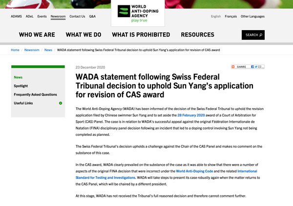 世界反興奮劑機(jī)構(gòu)(WADA)已獲悉,瑞士聯(lián)邦最高法庭決定支持中國游泳運(yùn)動(dòng)員孫揚(yáng)的改判申請(qǐng)并撤銷國際體育仲裁法庭(CAS)對(duì)其作出的禁賽裁決。