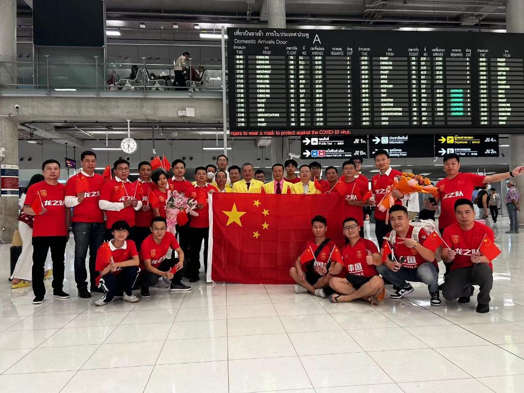 中國球迷在泰國機場準(zhǔn)備迎接國足抵達(dá)。
