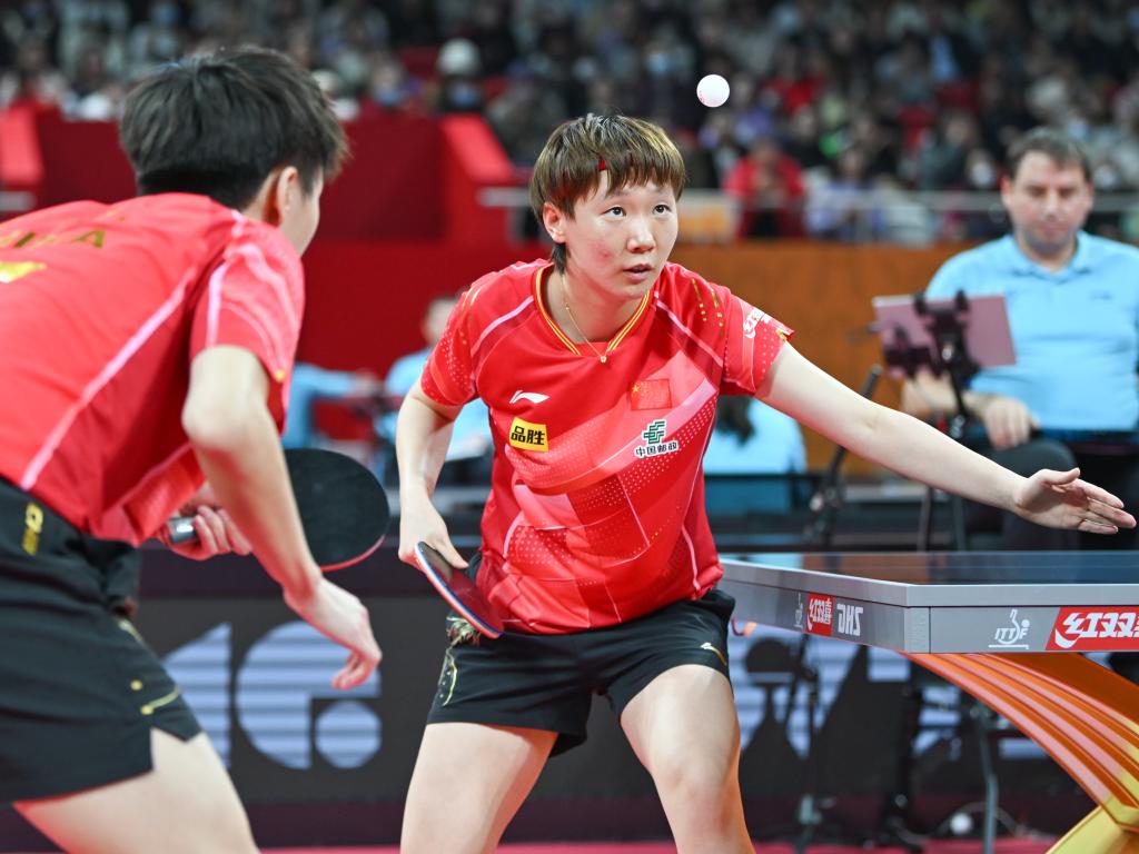 12月4日,中國隊組合林高遠(yuǎn)/王曼昱(右)在混雙比賽中。新華社記者 王曦 攝
