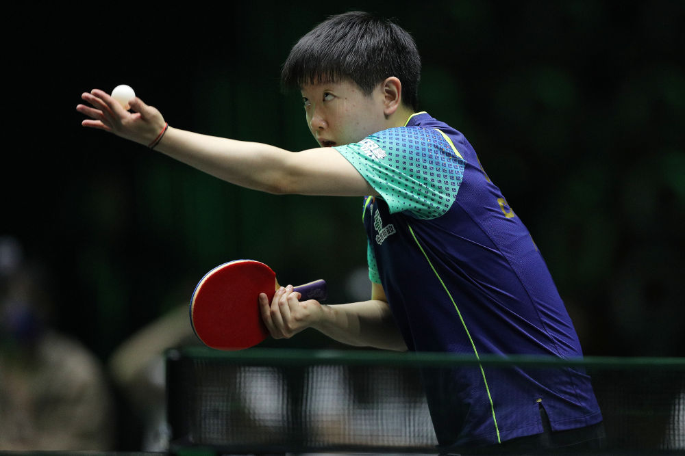 5月5日,中國(guó)隊(duì)選手孫穎莎在比賽中發(fā)球,她在女單首輪比賽中3:0戰(zhàn)勝中國(guó)臺(tái)北隊(duì)選手劉馨尹,晉級(jí)下一輪。新華社發(fā)(WTT世界乒聯(lián)供圖)