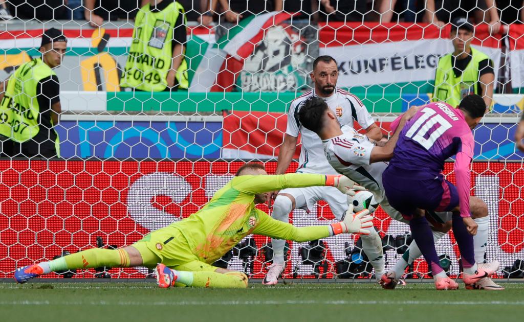 第22分鐘,維爾茨橫傳穆夏拉,后者直傳京多安,京多安對抗扛倒匈牙利后衛(wèi)奧爾班,主裁判沒有響哨。隨后京多安助攻穆夏拉攻門得手。經(jīng)視頻助理裁判(VAR)確認(rèn),進(jìn)球有效,德國隊1:0領(lǐng)先。21歲114天的穆夏拉成為在歐錦賽歷史上前兩場比賽都打入進(jìn)球的第二年輕的球員。