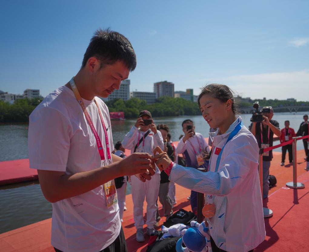 11月28日,何國潤(右)的男朋友向她求婚。當(dāng)日,在海南省三亞市舉行的第十二屆全國少數(shù)民族傳統(tǒng)體育運(yùn)動會獨(dú)竹漂女子組200米直道賽頒獎(jiǎng)儀式后,海南隊(duì)選手何國潤的男朋友在頒獎(jiǎng)儀式現(xiàn)場向她求婚,上演溫情一幕。新華社發(fā)(杜笑微攝)