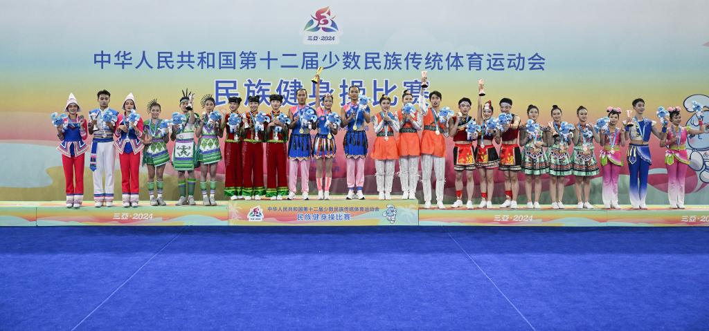 11月28日,這是第十二屆全國少數(shù)民族傳統(tǒng)體育運(yùn)動會民族健身操自選套路(輕器械)頒獎(jiǎng)儀式現(xiàn)場。新華社記者 孫凡越 攝