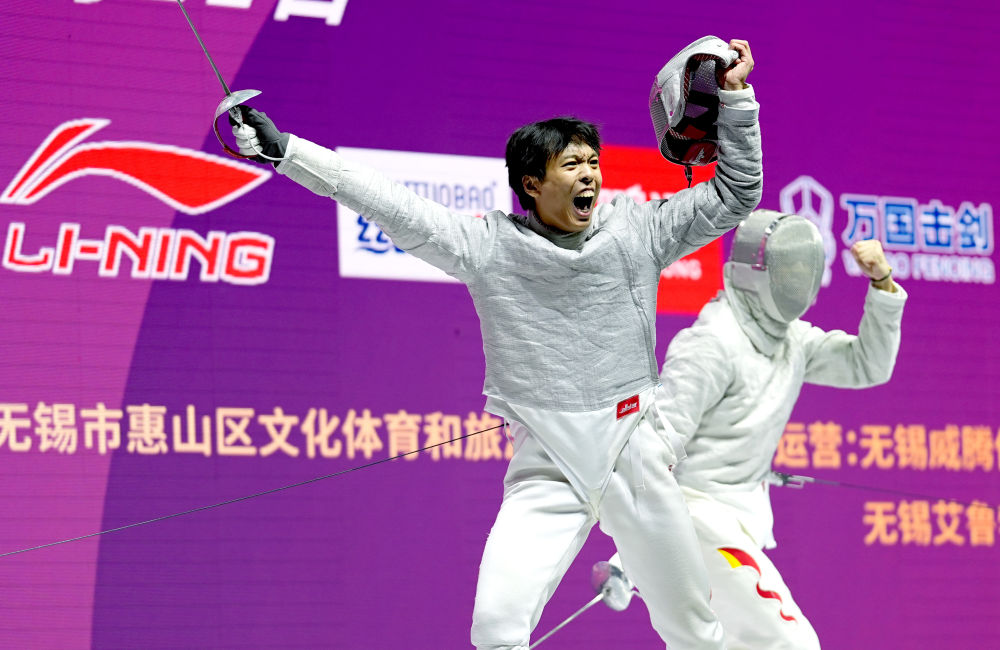 沈晨鵬(左)在男子佩劍團體賽決賽中慶祝得分