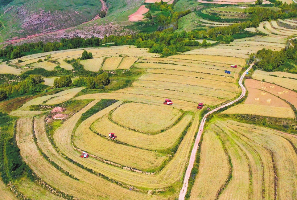 寧武縣頭馬營村萬畝莜麥種植基地機(jī)械化收割場景。吳光宇攝