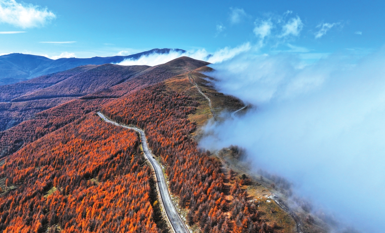 沿盤山路驅(qū)車而上,兩側(cè)的華北落葉松與云杉率先奏響秋之序曲。陽光穿透枝葉,將針葉染成琥珀色;山風(fēng)過處,整片林海翻涌著金色波浪。腳下厚厚的落葉層踩上去沙沙作響,散發(fā)著松針與腐殖土混合的清香。在黛螺頂觀景臺,常有云海自山谷間升騰,將五彩斑斕的山林切割成流動的色塊,宛如印象派大師筆下的油畫。
