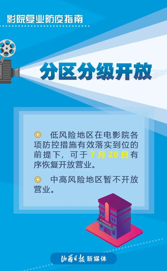 近日,國家電影局發(fā)布《關(guān)于在疫情防控常態(tài)化條件下有序推進電影院恢復開放的通知》稱,低風險地區(qū)在電影院各項防控措施有效落實到位的前提下,可于7月20日有序恢復開放營業(yè)。具體要求如下↓↓↓