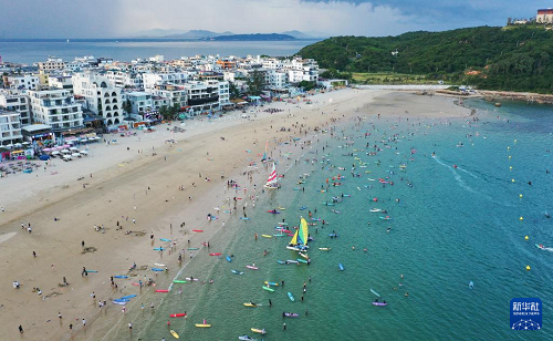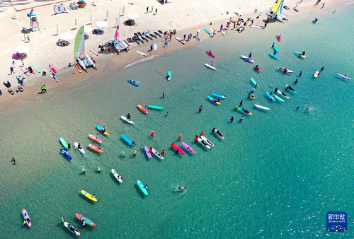 8月10日,游客在三亞市后海村附近海域沖浪嬉水(無人機照片)。(新華社記者 郭程 攝)