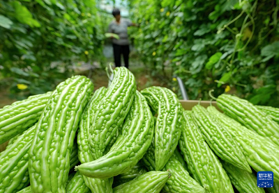 8月12日,河北省盧龍縣劉田各莊鎮(zhèn)六百戶村四季青蔬菜種植合作社社員在大棚內(nèi)采摘苦瓜。(新華社記者 楊世堯 攝)