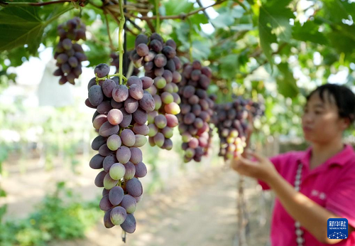 8月12日,河北省盧龍縣蛤泊鎮(zhèn)鮑子溝村一家葡萄種植合作社社員在采摘葡萄。(新華社記者 楊世堯 攝)