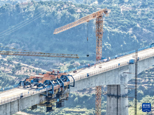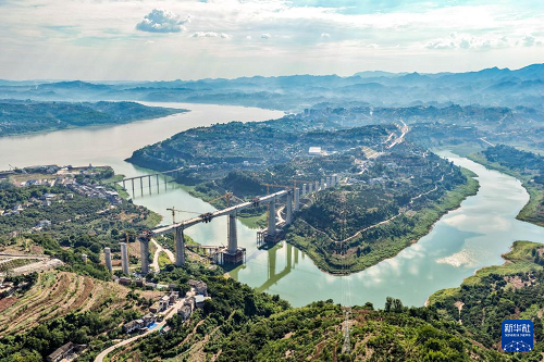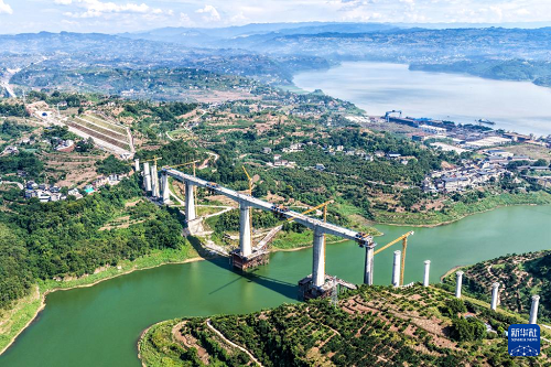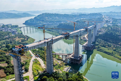 這是8月18日拍攝的渝萬高鐵渠溪河雙線特大橋施工現(xiàn)場(無人機(jī)照片)。(新華社記者 唐奕 攝)