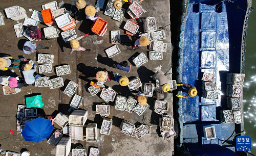 在海南省文昌市清瀾漁港碼頭,漁民和商販在卸貨、交易(8月21日攝,無人機(jī)照片)。(新華社記者 郭程 攝)