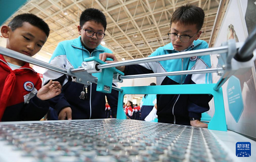 9月8日,在甘肅省定西市舉辦的“山海相依,筑夢(mèng)蔚藍(lán)”山東青島·甘肅定西海洋科普東西部協(xié)作主題活動(dòng)中,定西市安定區(qū)關(guān)川實(shí)驗(yàn)學(xué)校的學(xué)生在流動(dòng)科技館內(nèi)體驗(yàn)科普裝置。(新華社發(fā) 王克賢 攝)