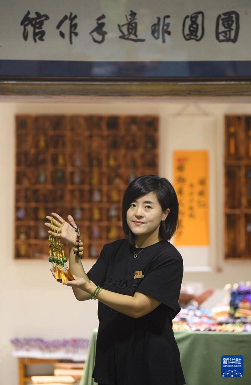 9月9日,在臨安龍崗鎮(zhèn)一家山核桃生產(chǎn)企業(yè),負(fù)責(zé)人陳潔展示利用山核桃空籽制作的文創(chuàng)產(chǎn)品。(新華社記者 翁忻旸 攝)