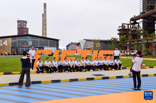 9月10日,工作人員在北京首鋼園與一處服貿(mào)會(huì)英文標(biāo)識(shí)合影。(新華社記者 徐欽 攝)
