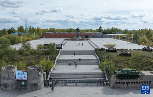 9月18日,人們在內蒙古呼倫貝爾市海拉爾區(qū)世界反法西斯戰(zhàn)爭海拉爾紀念園參觀(無人機照片)。(新華社記者 貝赫 攝)