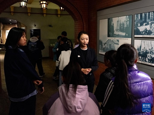 9月18日,在內蒙古呼倫貝爾市,講解員為參觀世界反法西斯戰(zhàn)爭海拉爾紀念園的小學生講解。(新華社記者 馬金瑞 攝)