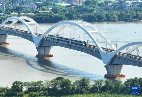 9月29日,列車駛?cè)霝I??炀€帝封江站(無人機(jī)照片)。(新華社記者 林善傳 攝)